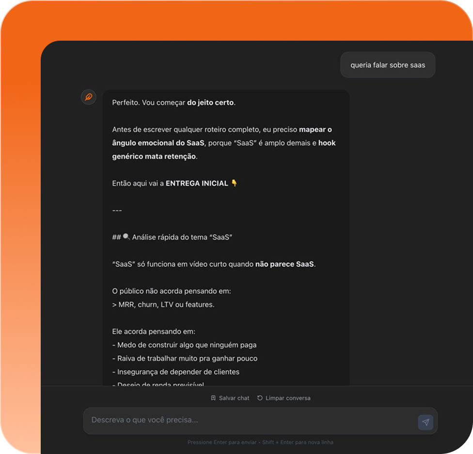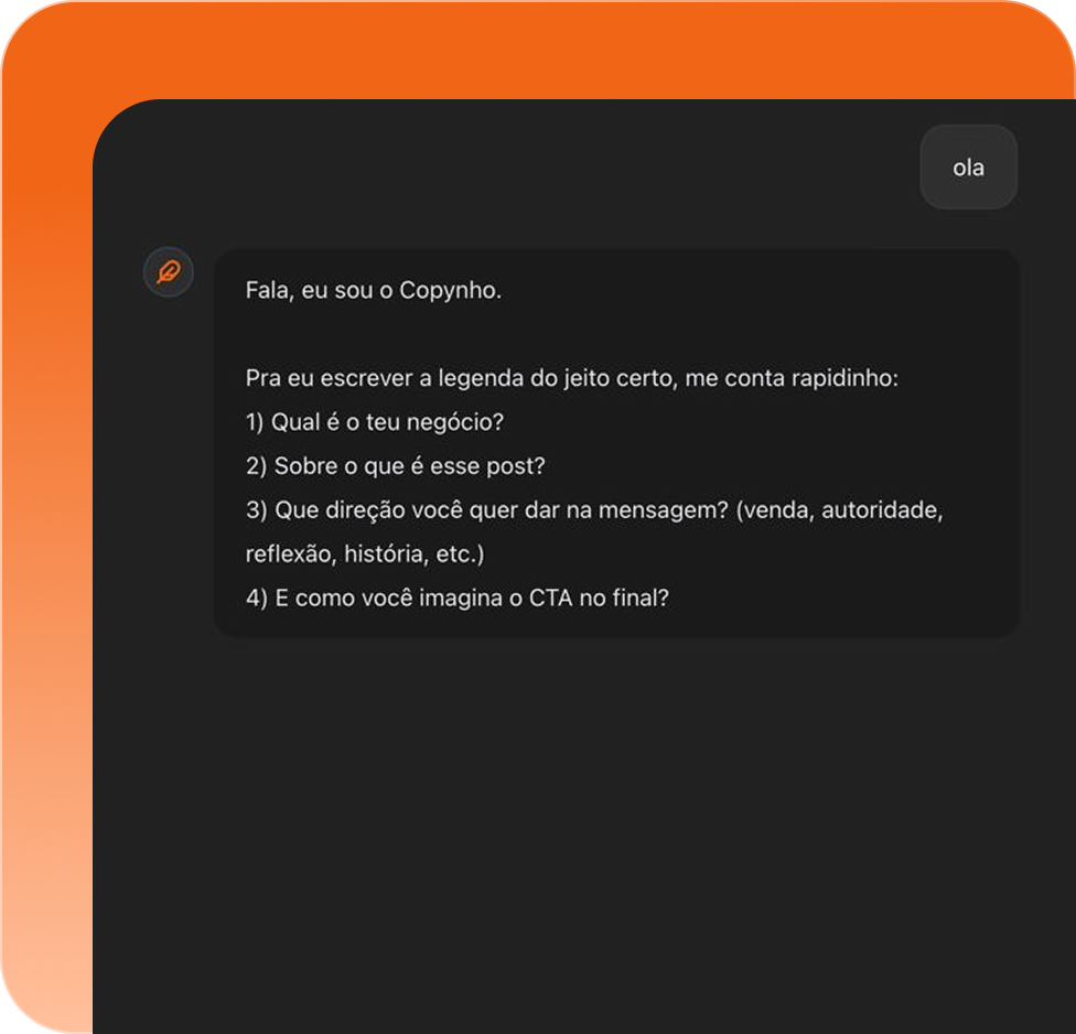 Você cria qualquer tipo de copy: páginas de vendas, e-mails de lançamento, anúncios para Facebook e Instagram, scripts para reels, legendas persuasivas, cartas de vendas e muito mais – tudo em um único lugar, ilimitado.
